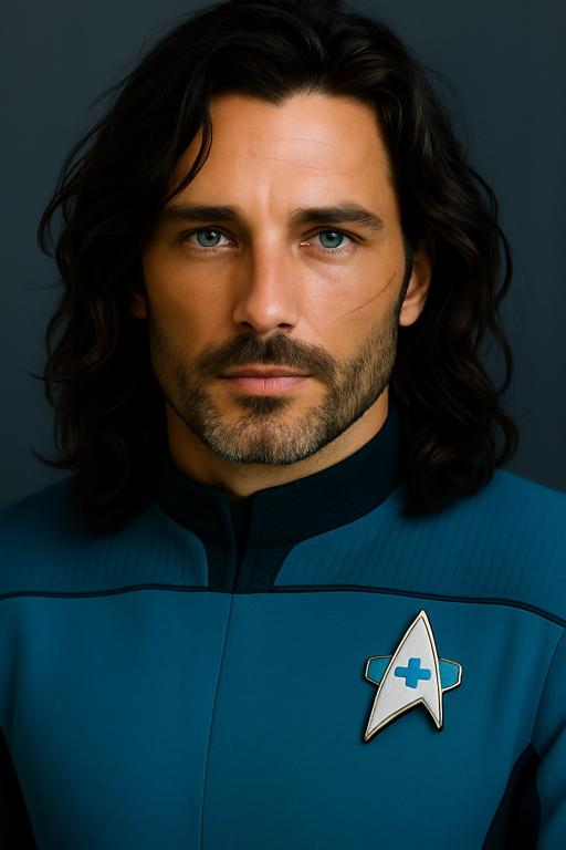 | Physical Description | Mezan Boone has a fit, lean build shaped by years of physical discipline rather than vanity. His skin tone is even and unblemished. His hair is long and loosely wavy, typically worn free unless medical protocol requires containment. His beard is neatly groomed, framing distinct features softened by patience. A single thin white scar rests along his left cheek, marking that the body he currently inhabits is his second Cam h’lan vessel. His gaze is calm and steady, carrying a quiet depth that many find grounding in high-stress situations. |
