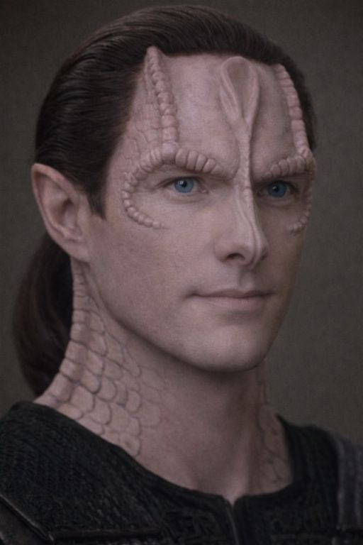 | Physical Description | Darik has a lean, angular build and a still, watchful presence that can make him seem more imposing than he really means to. His Cardassian heritage is obvious at a glance, though softened by his human side. The central forehead crest and spoon-shaped brow depression are there, but less pronounced than in a full Cardassian, while fine ridging and scale-like patterning mark his neck and the sides of his face. His features are striking rather than soft, with a strong jaw, high cheekbones, and a face that tends to settle into composure or faint, dry disapproval if left to itself. His blue eyes are one of the first things people notice, cool and sharp at first glance, though more expressive than he would always like when he is caught off guard. His hair is worn longer than strict practicality really calls for and he usually has it tied back in a low ponytail. |