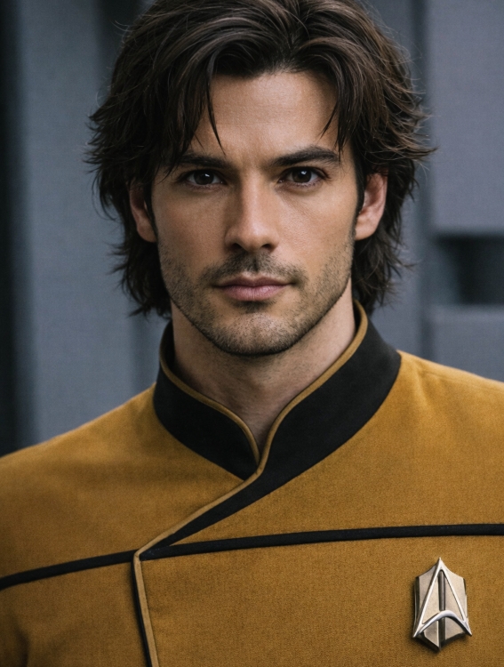 | Physical Description | Toran has the classic black Betazoid eyes that can often seem unreadable. He has well defined, expressive features with a defined jaw, high cheekbones and slightly furrowed brow that makes him look thoughtful or focussed. His dark hair is a little longer than the usual crop, giving it a slightly tousled look. He has a tall, lean frame, clearly athletic from disciplined daily training. Overall, Toran has a quiet intensity to his presence, but can also have a world-weary warmth about him when relaxed. |