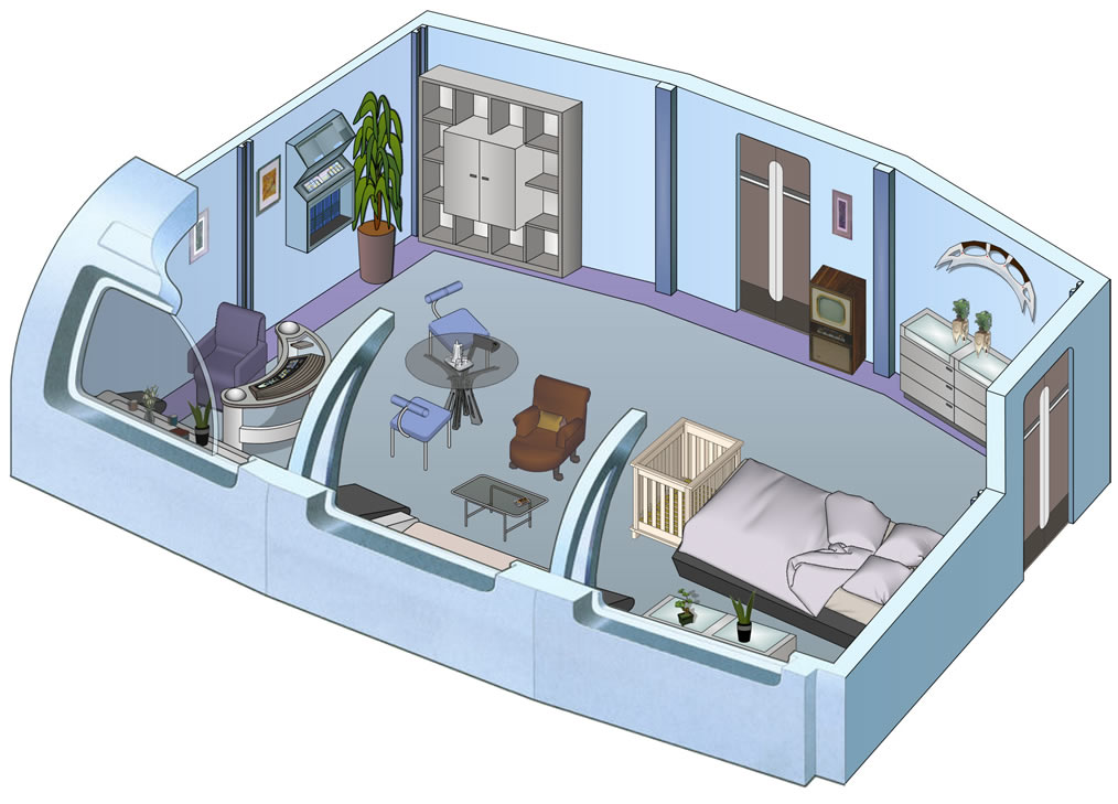 | Description | Junior Officers who are not a department head are assigned these quarters and may be required to share them with one other Junior Officer. While the living space is all in one room, they have more space than enlisted quarters. |